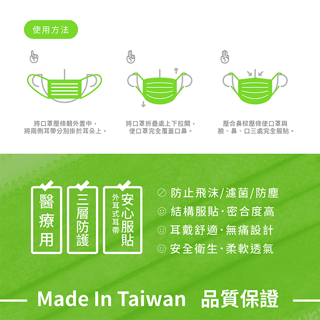 ① 本產品為拋棄式口罩,請勿洗滌或多次使用。