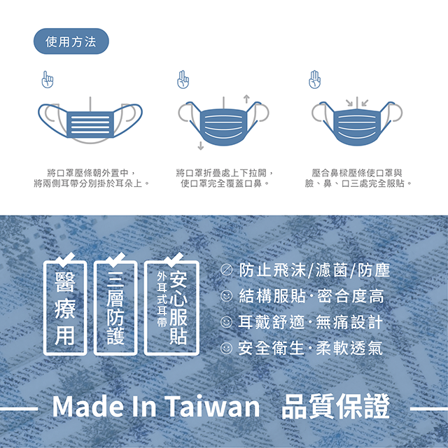 ① 本產品為拋棄式口罩,請勿洗滌或多次使用。