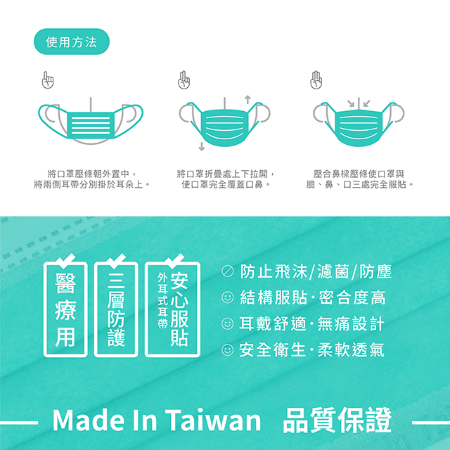 ① 本產品為拋棄式口罩,請勿洗滌或多次使用。